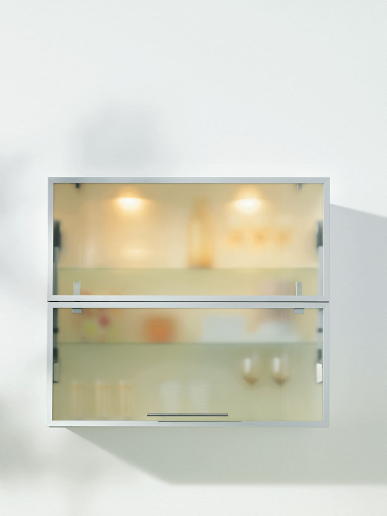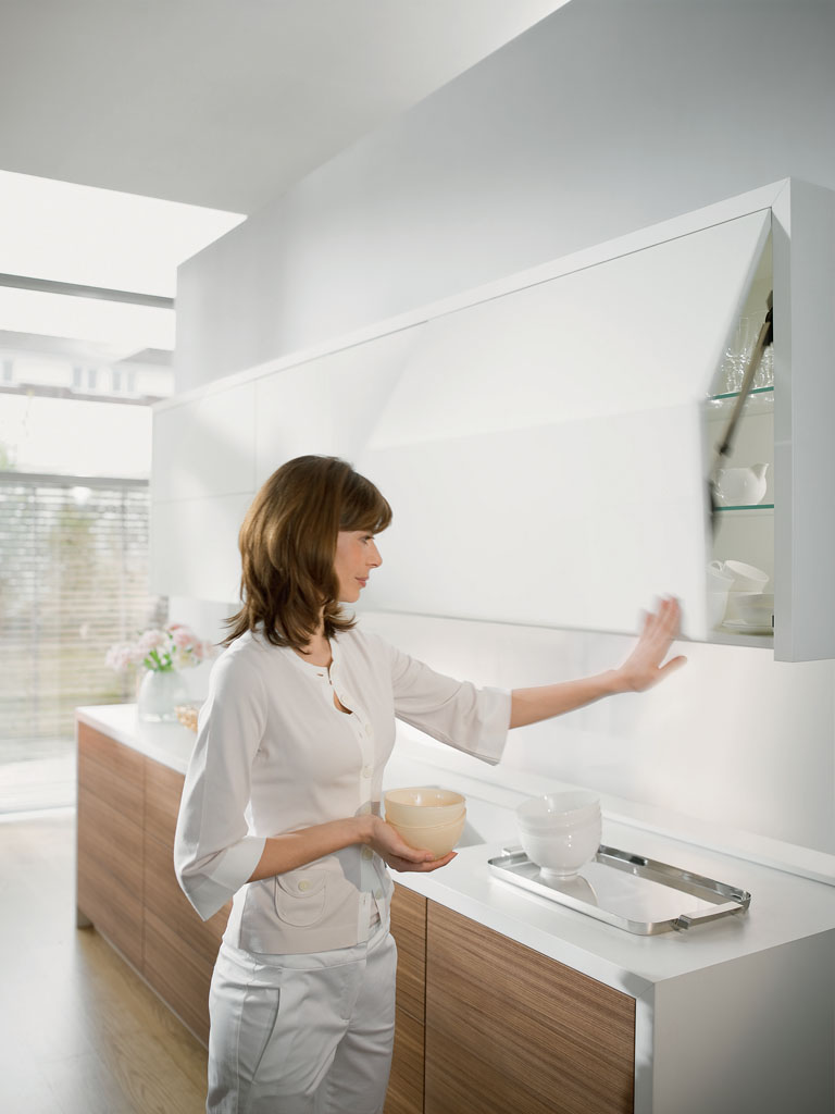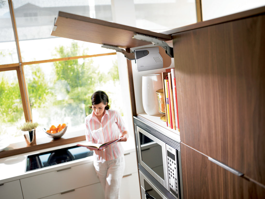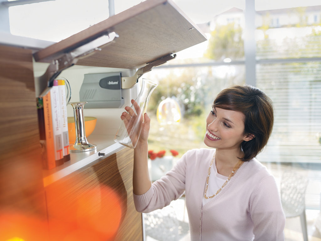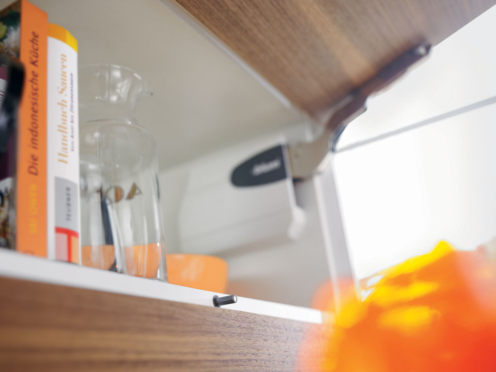 The Aventos HK takes into account cabinets with cornices and crown moulding. This provides more design freedom for kitchen planning.