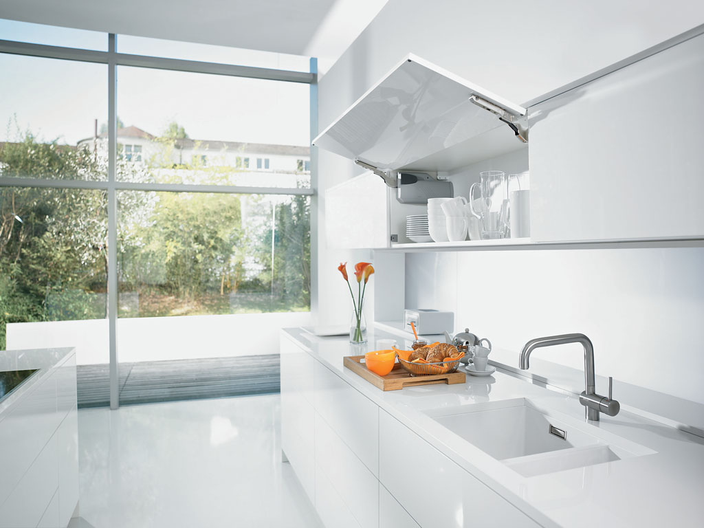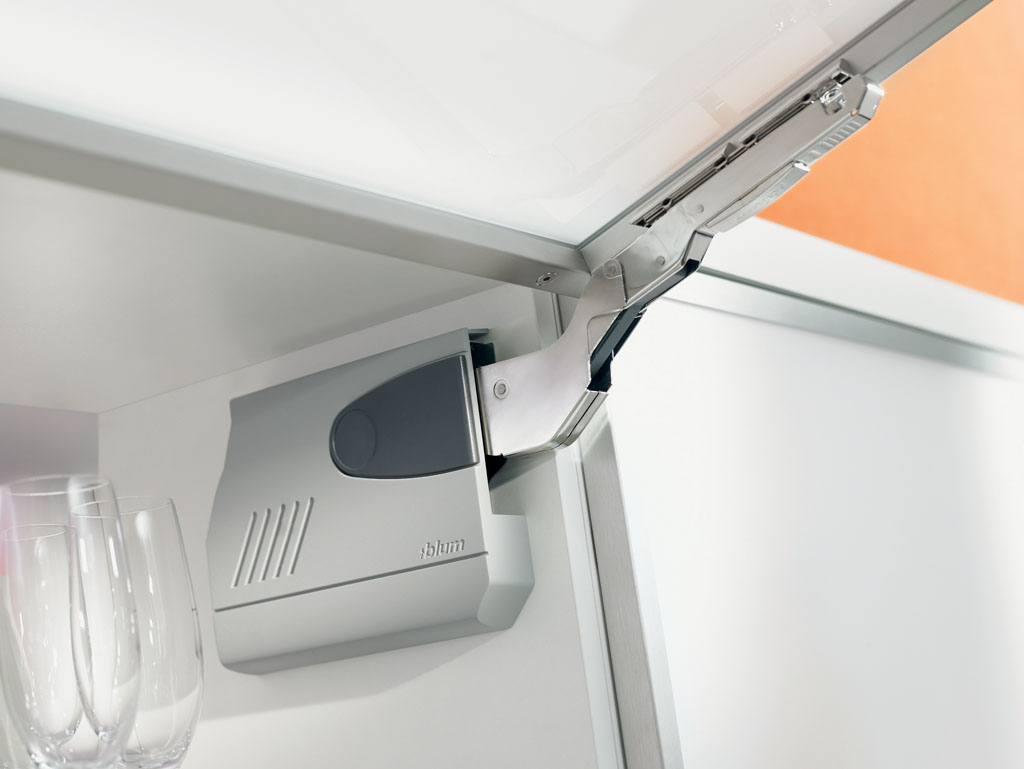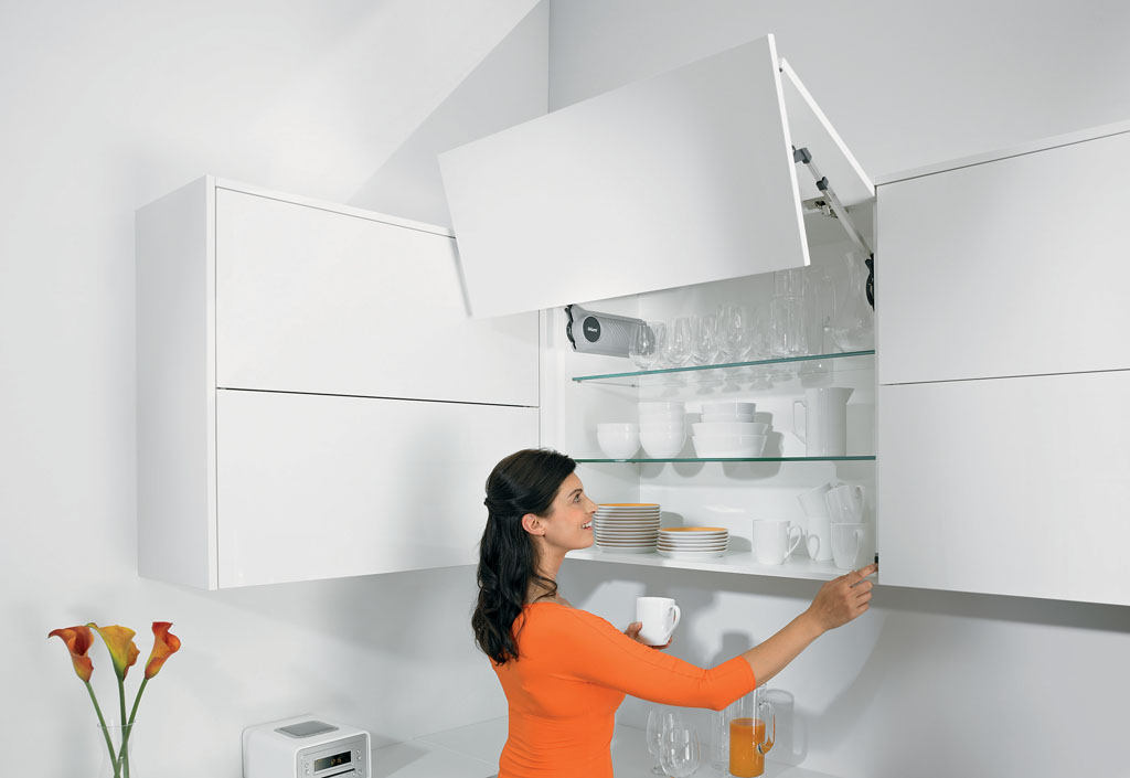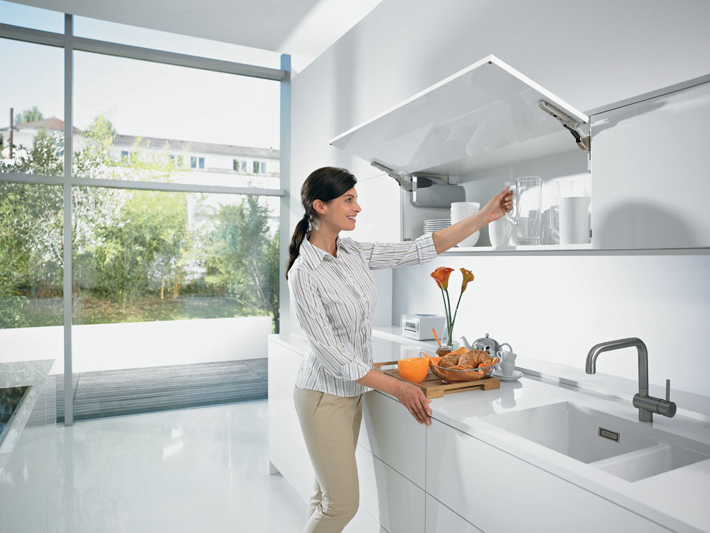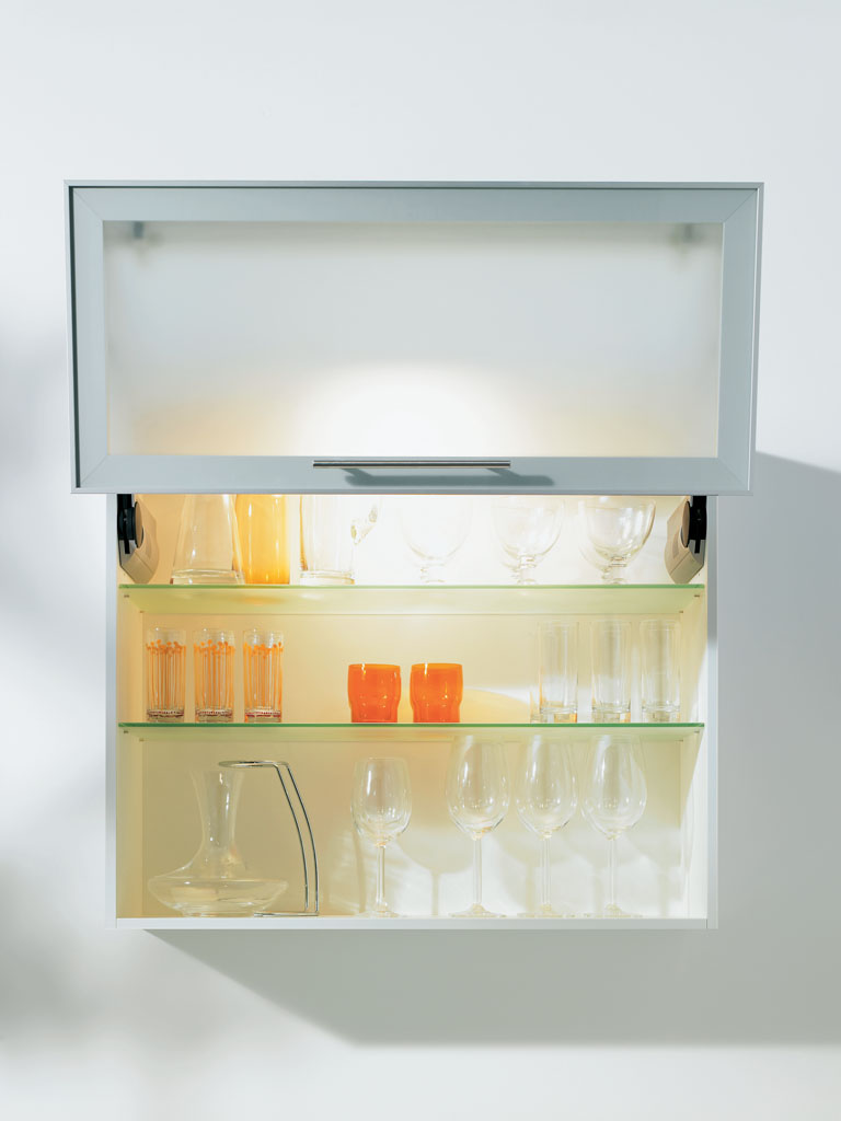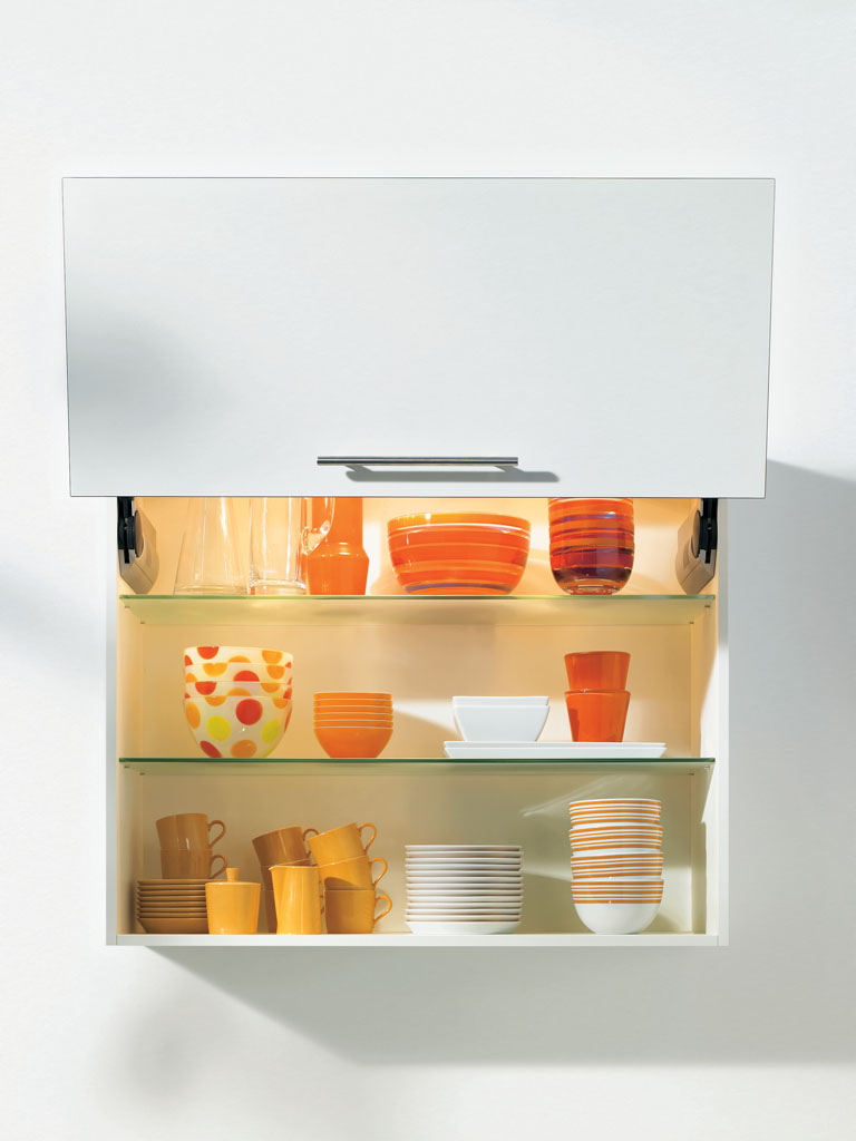 The Aventos HK takes into account cabinets with cornices and crown moulding. This provides more design freedom for kitchen planning.